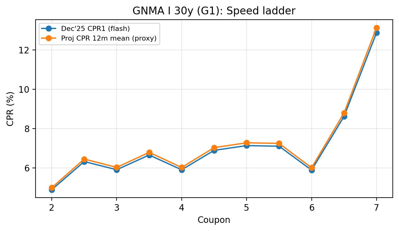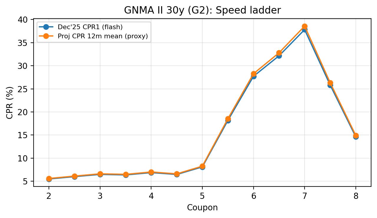 Run date: January 8, 2026. Speeds reflect Dec 2025 (flash reports). Inputs used: (1) Uploaded flash reports (FN/FH/G1/G2) for Dec'25. (2) Market/rate inputs are kept consistent with the attached template (Treasury par curve 01/07/2026; primary mortgage rate proxy 6.19%; TBA closes 01/06/2026). Executive summary The Dec'25 flash data shows a pronounced speed kink in higher coupons. UMBS (FNMA+FHLMC) accelerates materially from 5.5 to 6.0 and above, while GNMA II runs even faster at premium coupons. Using a simple rate-scenario proxy (stylized one-factor short-rate evolution) and a frictional refinance-incentive rule, premium coupons retain meaningful right-tail refinance risk even if the base-rate path is stable. Rates + prepay model (proxy) We use a stylized one-factor short-rate simulation (monthly, 12 months) anchored to the template Treasury curve and mapped to a mortgage-rate proxy via a constant spread to the 10-year point. Prepayment projection applies a refinance incentive function with friction: CPR only increases materially when simulated mortgage rates fall sufficiently below the current primary-rate proxy. Parameters are chosen for relative coupon ranking rather than absolute forecasting. Key assumptions (for transparency): mean reversion a=0.15, short-rate vol sigma=1.0% (annualized), refi friction=50bp, sensitivity beta=18. UMBS 30y ladder (FNMA + FHLMC aggregated)